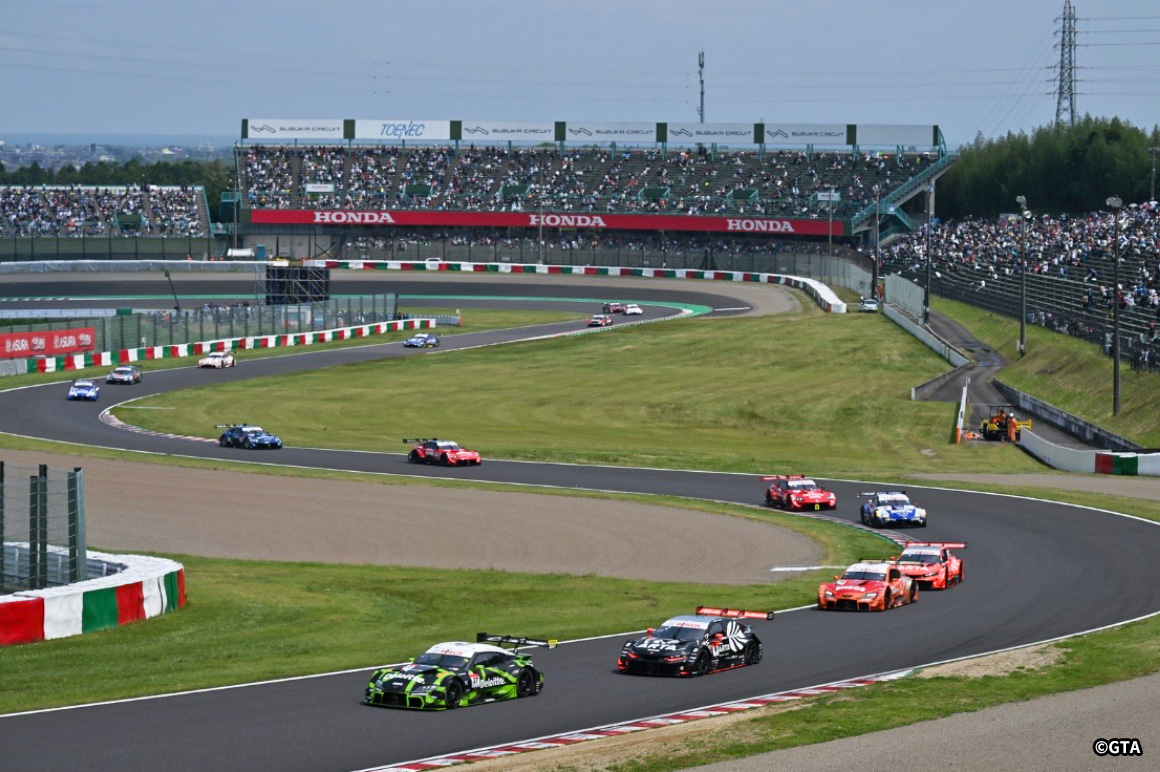 カラフルに光る各チームのGTマシンの車列が鈴鹿サーキットのコース上を走り抜ける